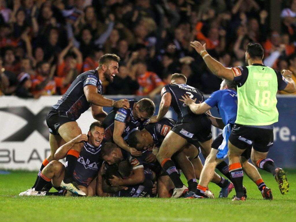 Castleford celebrating with Luke Gale after his successful drop goal in the 2018 Super League Semi-Final against Saints